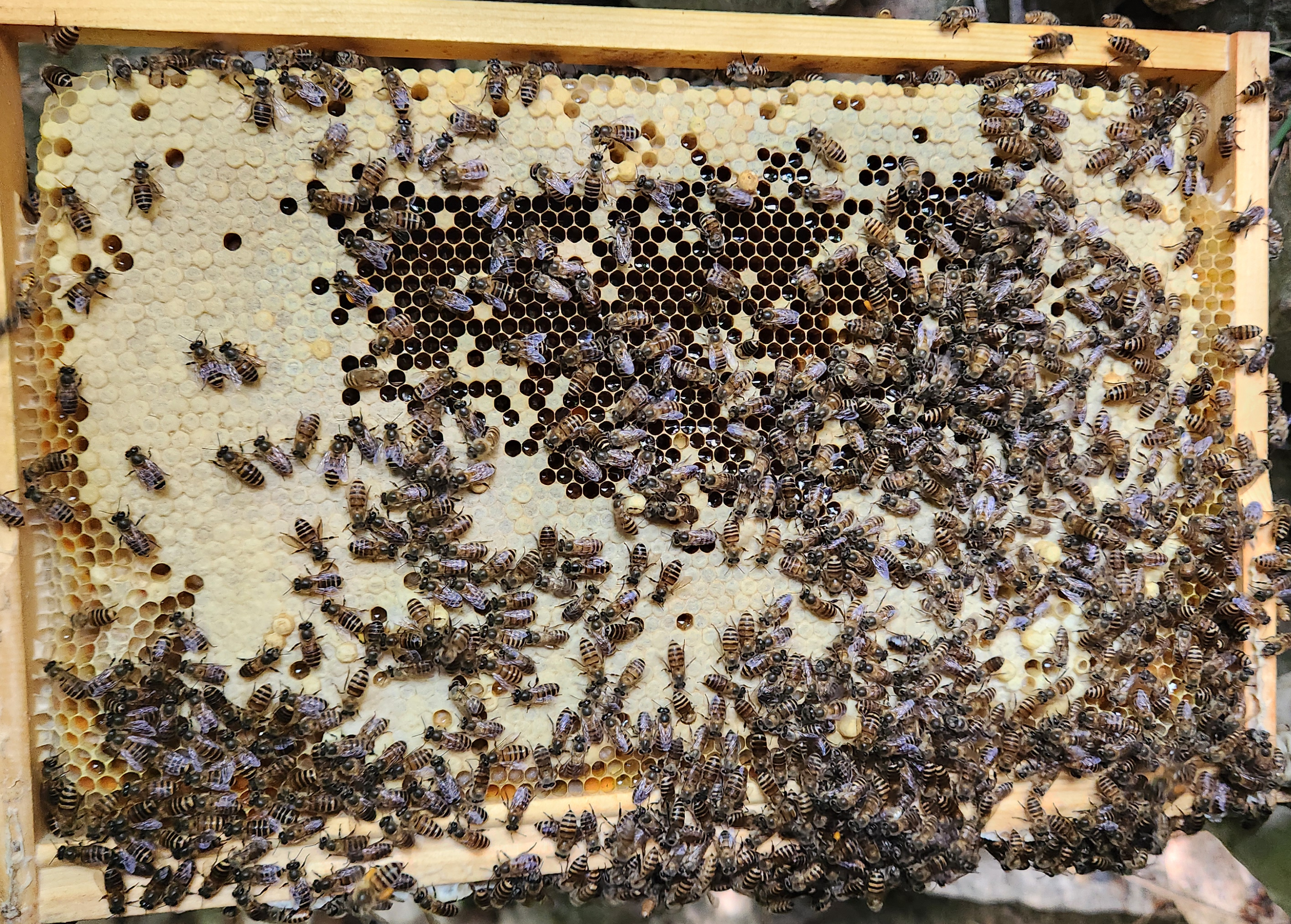 | 6주차: 낭충병 없이 각 산란 나가지만 세력이 좋아지지 않음. 여왕벌 교체해주지 않은 것이 후회됨. (설탕물+이산화염소수를 2~3일에 한번씩 저녁 분무.) |